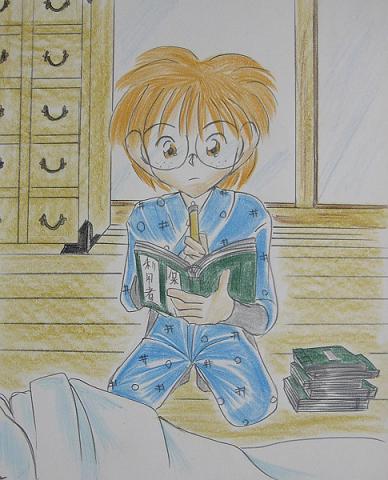 きな子様のリクエスト「保健委員の仕事してる乱太郎」です。 うっかり方向性を聞きそびれてしまい(きな子様すいません)第一弾だしと、オーソドックスなイラストにしてみました。 状況としましては、具合が悪い人の様子を観ながら利用者名簿記入中★と、いったところ。 手前の布団で寝ている方はご自由に想像下さい(笑)リクエスト者のみお持ち帰り可です。